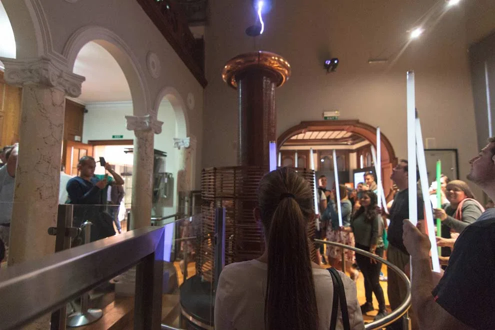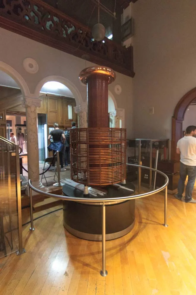 I was expecting a much bigger layout, but even though it's small, the demonstration was impressive. They show a 15 minute video on the history of Tesla and his accomplishments. And then they demonstrate a few of his most important inventions like the alternating current (AC) coils, the remote control, and spinning motors.
