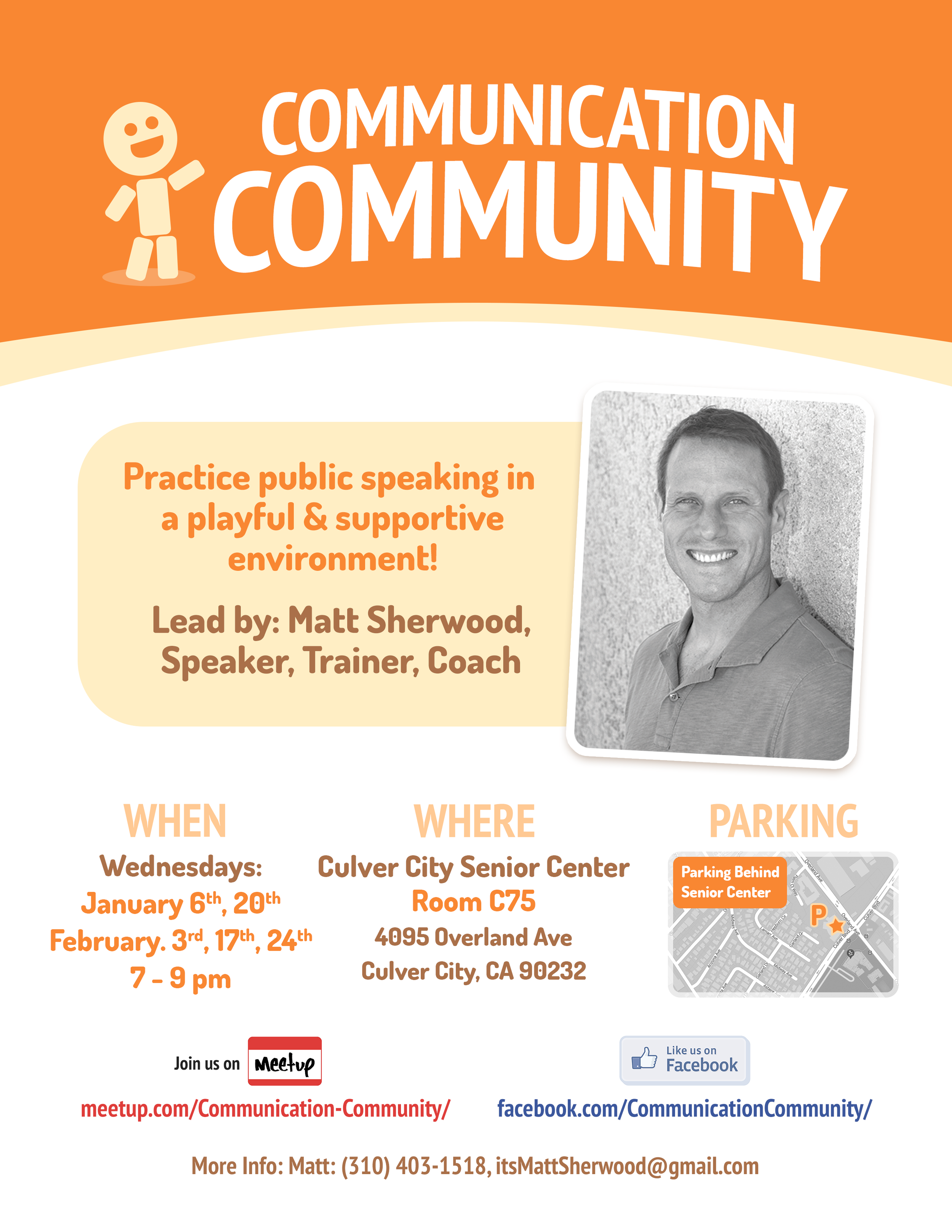 Matt Sherwood is the founder of Communication Community, a free public speaking workshop in the Los Angeles area. Our next meetup is Wednesday, October 21st at 7pm in Culver City! Check us out on Meetup and Facebook: http://www.meetup.com/Communication-Community https://www.facebook.com/CommunicationCommunity