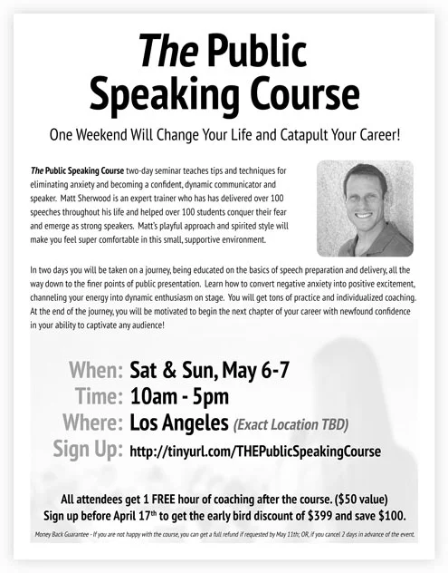 The Public Speaking Course two-day seminar teaches tips and techniques for eliminating anxiety and becoming a confident, dynamic communicator and speaker. Matt Sherwood is an expert trainer who has has delivered over 100 speeches throughout his life and helped over 100 students conquer their public speaking fear and become strong speakers. Matt’s playful approach and spirited style will make you feel super comfortable in this small, supportive environment.